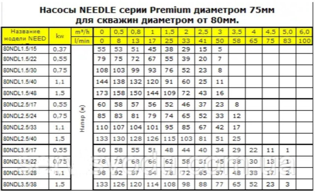 NEEDLE - у перекладі з англійської мови це «голка». І справді свердловинні насоси торгової марки NEEDLE є унікальними, так як можуть використовуватися в свердловинах малих діаметрів. Серії 80NDL (діаметром 75 мм.) - це унікальне рішення щодо співвідношення ціна/якість для свердловин малих діаметрів (від 80 мм), і ні для кого не секрет, що вартість свердловини дуже сильно залежить від діаметра колони. Насоси 80NDL дозволяють радикально скоротити кошторис буріння. Насос для свердловини 80NDL використовуються для загального водопостачання, створення та підтримки тиску у водних магістралях, зрошувальних установках. Можуть застосовуватись із впровадженням механічної або електронної схеми управління в системах автоматичної подачі води. Насоси даної серії рекомендуються для перекачування чистої води, що містить не більше 150 г/м3 піску і температурі до +35˚С. Максимальна глибина занурення до 80м нижче статичного рівня (висота водяного стовпа над насосом). Однією з переваг цих насосів є максимальна кількість запусків, яка досягає 200 включень за годину. У комплекті додається кабель електроживлення довжиною 1,5м.